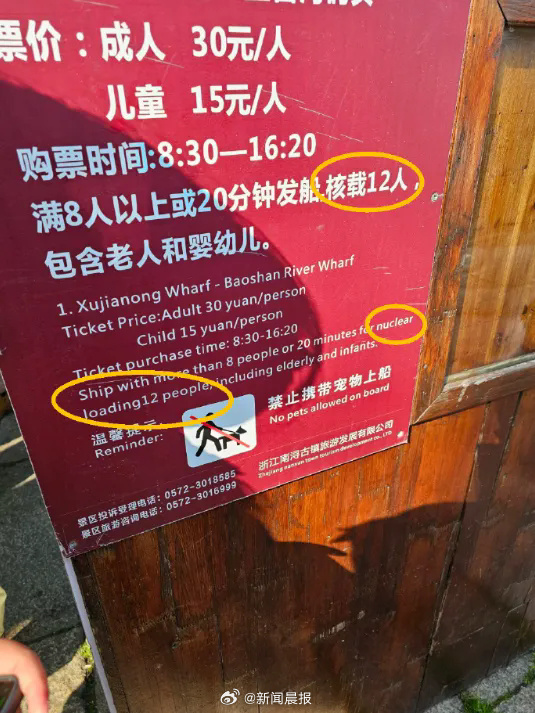 发帖的上海游客向记者表示,自己在南浔古镇游玩时,发现景区观光船售票牌上的英文翻译存在乌龙,将“核载12人”误译为“nuclear loading 12 people”(直译“12人核能装载”),帖文中该游客戏称其为“核动力观光船”,引来网友热议。