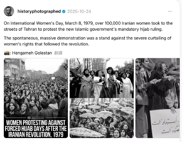 这场发生在1979年3月的示威,成为伊朗当代妇女运动历史中的重要事件之一,也留下了多组记录当时街头场景的影像,其中最著名的一组照片由伊朗摄影师 Hengameh Golestan 拍摄。
