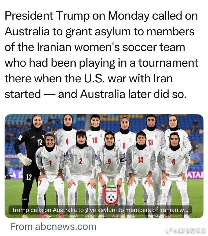 多名伊朗女足队员在澳大利亚获庇护,特朗普曾致电澳总理促批申请;澳方已批准相关请求。