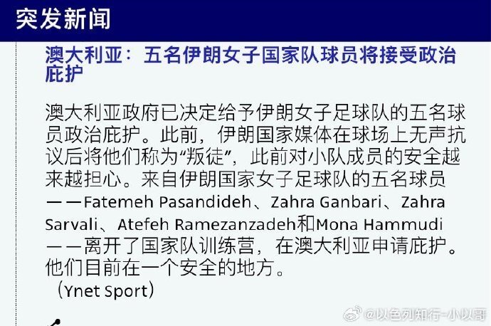 【11】伊朗女足队员脱离哈梅内伊政权,在澳大利亚寻求庇护。