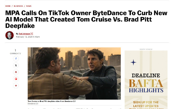 【3】美国电影协会警告TikTok母公司字节跳动,要求停止其旗下新推出的AI模型Seedance 2.0滥用受版权保护的作品: