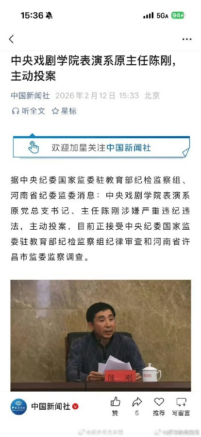 中戏表演系原主任陈刚主动投案:因涉嫌严重违纪违法,正接受纪律审查和监察调查。事件或与冒名顶替入学举报有关。