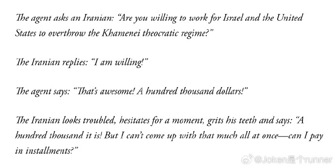 社会讽刺:一则关于伊朗民众因经济困顿愿“分期付款”参与颠覆政权的笑话,反映当地民生艰难。