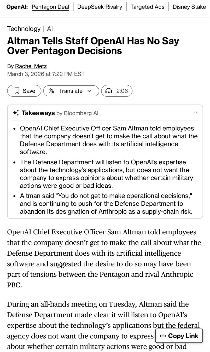 【20】OpenAI CEO Sam Altman 在周二的全员大会上对员工摊牌:五角大楼怎么使用 OpenAI 的 AI,公司说了不算。