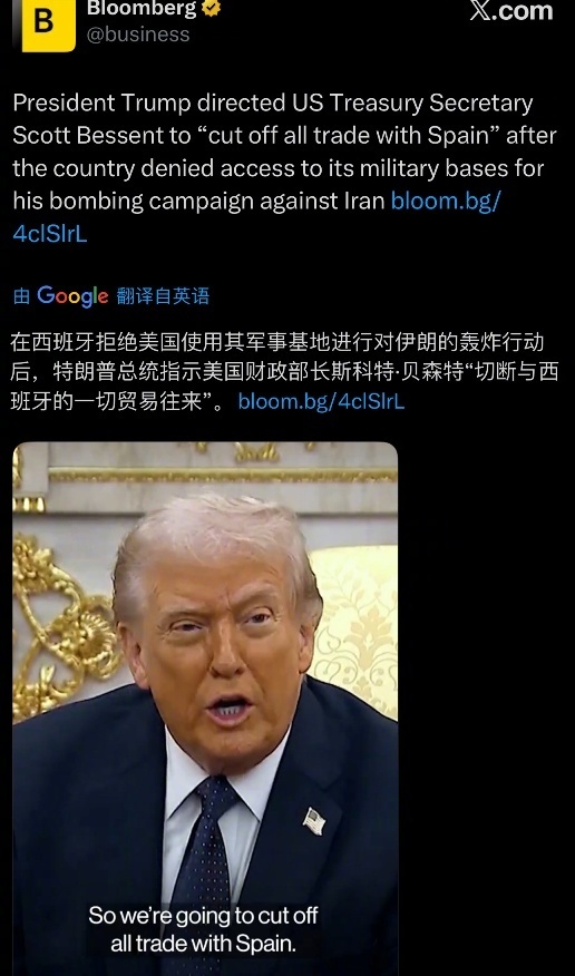 特朗普威胁切断与西班牙贸易:因西拒允美军使用基地打击伊朗,特朗普扬言断贸;西班牙称不会屈服,并将推动供应链多元化。