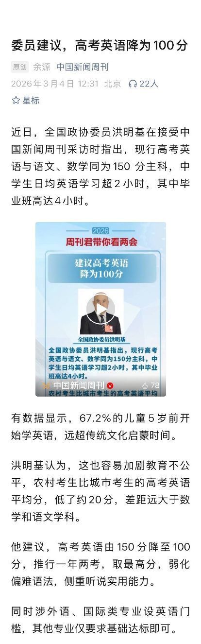 高考英语改革建议:政协委员洪明基提议将英语分值由150分降至100分,推行一年两考,侧重实用能力,以缓解城乡教育不公平。