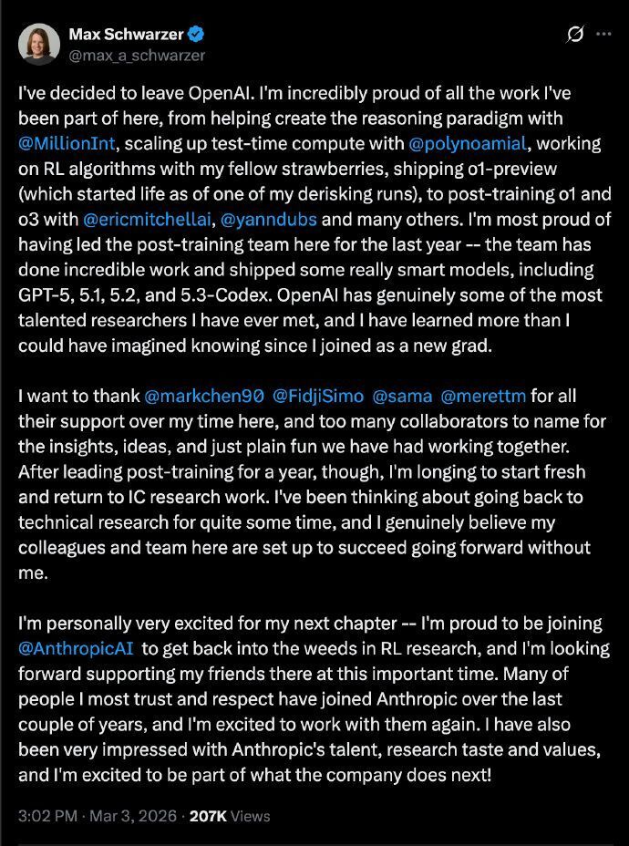 【19】OpenAI 推理模型核心研究员 Max Schwarzer 宣布离职,下一站是 Anthropic。