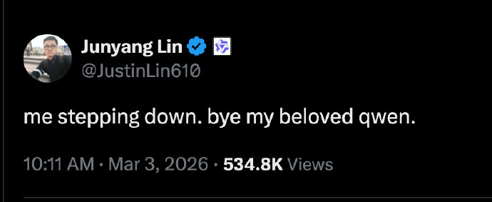 【5】Qwen 技术负责人 Junyang Lin 今天在 X 上发了一条简短的告别:"me stepping down. bye my beloved qwen."(我退出了。再见,我挚爱的 Qwen。)