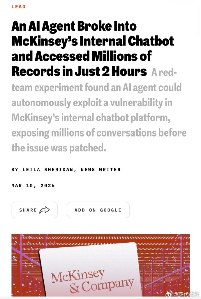 【19】外部一个 AI 代理,用了不到两个小时就攻破了麦肯锡的内部 AI 系统 Lilli——系统里大约 4650 万条聊天记录,以及包括系统提示在内的各种数据,都能在没有任何身份验证的情况下被读取甚至写入。