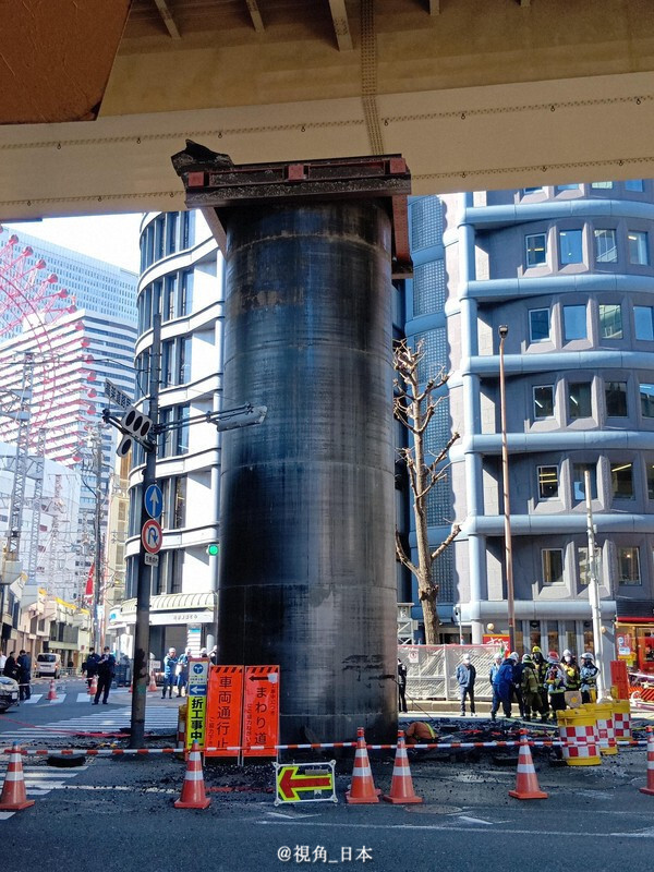 【15】奇闻:使徒来袭?大阪地面一夜之间出现一根巨型“支柱”。3月11日早晨,来往大阪市北区新御堂筋的市民发现一根原本埋在地下的巨型金属管道突然冲出地面,高达18米。警方称该路段正在进行下水道隧道施工,这根全长30米,直径5米的金属管原本埋在地下,因不明原因突然冲出地面。而管道上方正是大阪府北部的交通大动脉新御堂筋高架。消防赶到后在管道上打了孔并开始注水,利用重力让管道缓慢下降。目前负责下水道施工的大阪市建設局正在调查管道冲出地面的原因。
