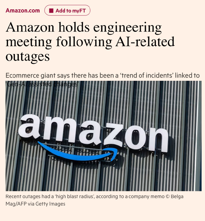 亚马逊AI编码工具致多起故障:系统宕机事故与AI生成代码相关,已要求AI辅助代码须经资深工程师审批;裁员或加剧运维压力。