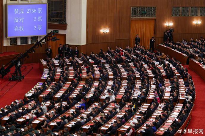 中国#全国人大会议#闭幕会星期四(3月12日)下午在北京人民大会堂举行,通过11项表决,其中广受瞩目的民族团结进步促进法,获2756票赞成,三票反对、三票弃权。