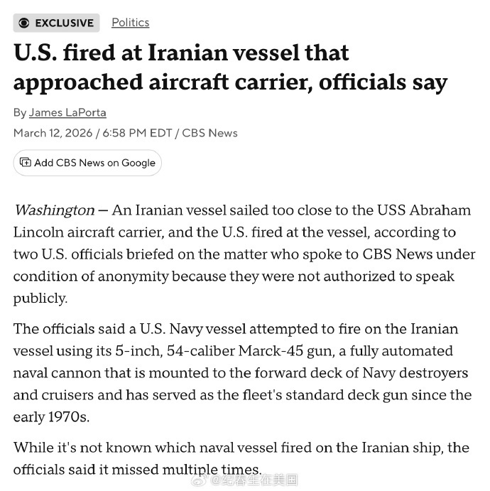 【18】美军舰艇对伊朗船只开火未果:在阿拉伯海,美舰主炮多次射击未命中靠近航母的伊朗船只,后由直升机发射“地狱火”导弹击中目标。