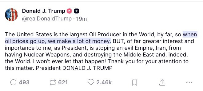 【20】川普发文说油价越高越好:“...当油价上涨,‘我们’能赚很多钱。”
