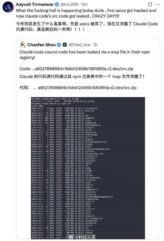 Anthropic源码泄露:因配置失误,Claude Code编程工具约51.2万行TypeScript源码意外公开,但核心大模型未受影响。