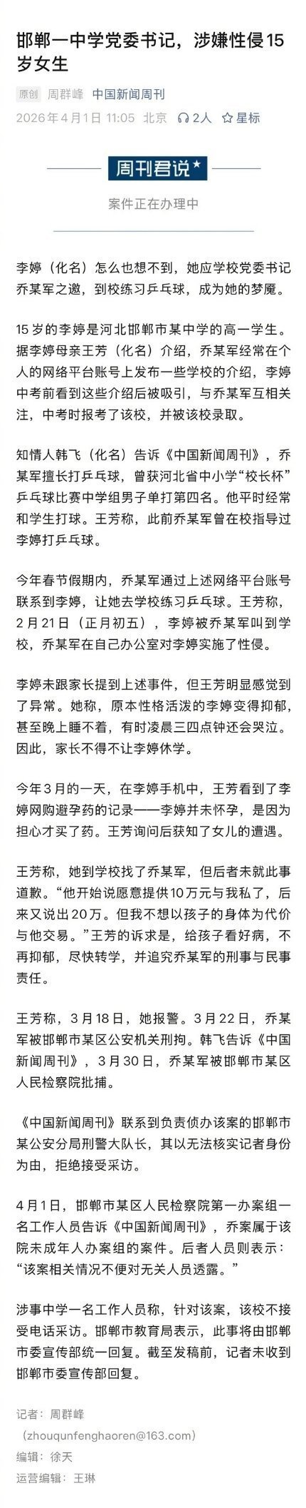 邯郸中学党委书记涉嫌性侵15岁女生被捕:涉事书记被指性侵并试图以最高20万元私了,女生母亲通过网购避孕药发现异常。