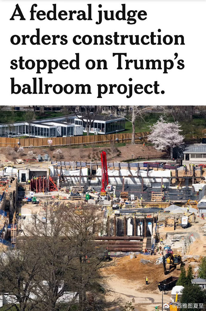 联邦法官叫停白宫宴会厅施工:裁定总统无权擅自建设,须国会授权,工程立即停止。