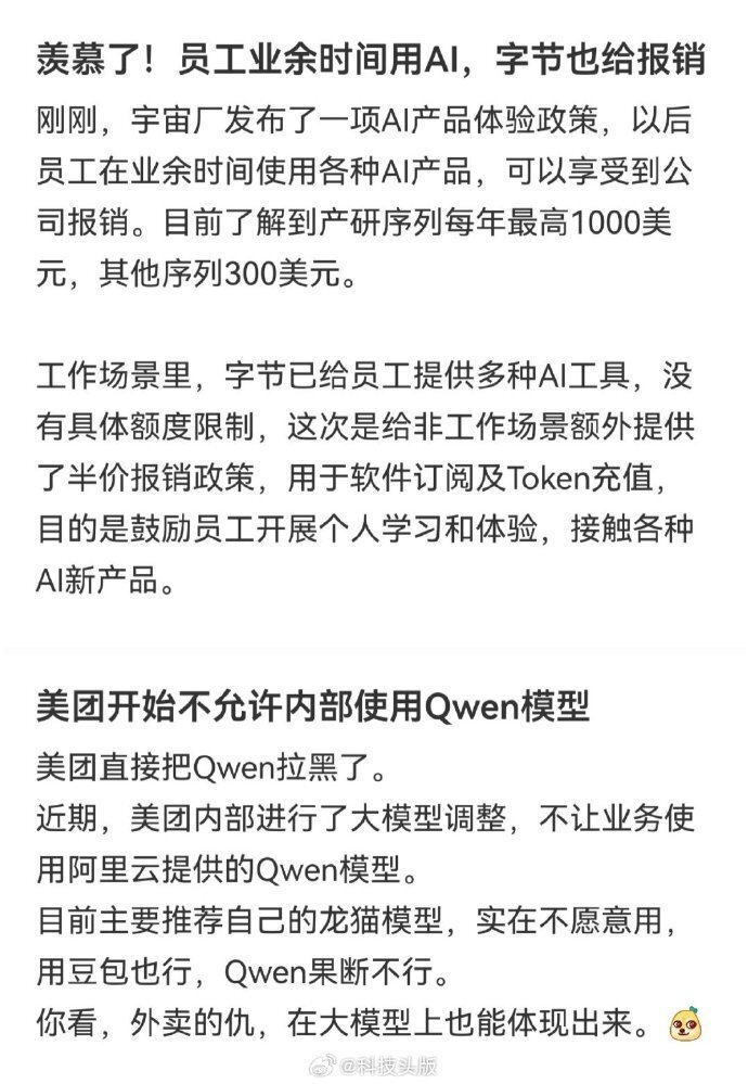 【8】大厂对待外部AI态度各不相同,美团、京东屏蔽竞对大模型,字节鼓励员工业余时间体验AI还能半价报销。