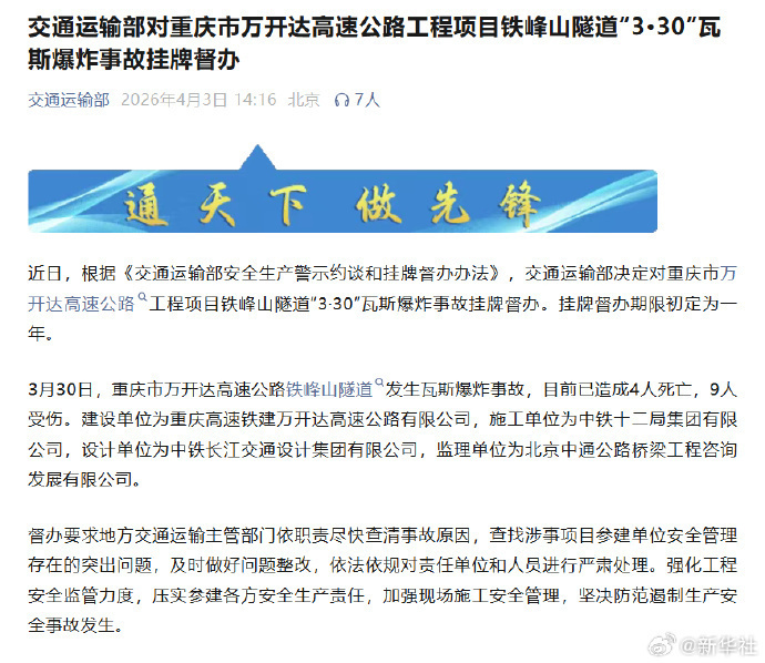 据新华社,近日,根据《交通运输部安全生产警示约谈和挂牌督办办法》,交通运输部决定对重庆市万开达高速公路工程项目铁峰山隧道“3·30”瓦斯爆炸事故挂牌督办。挂牌督办期限初定为一年。