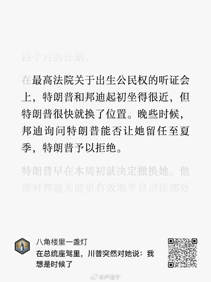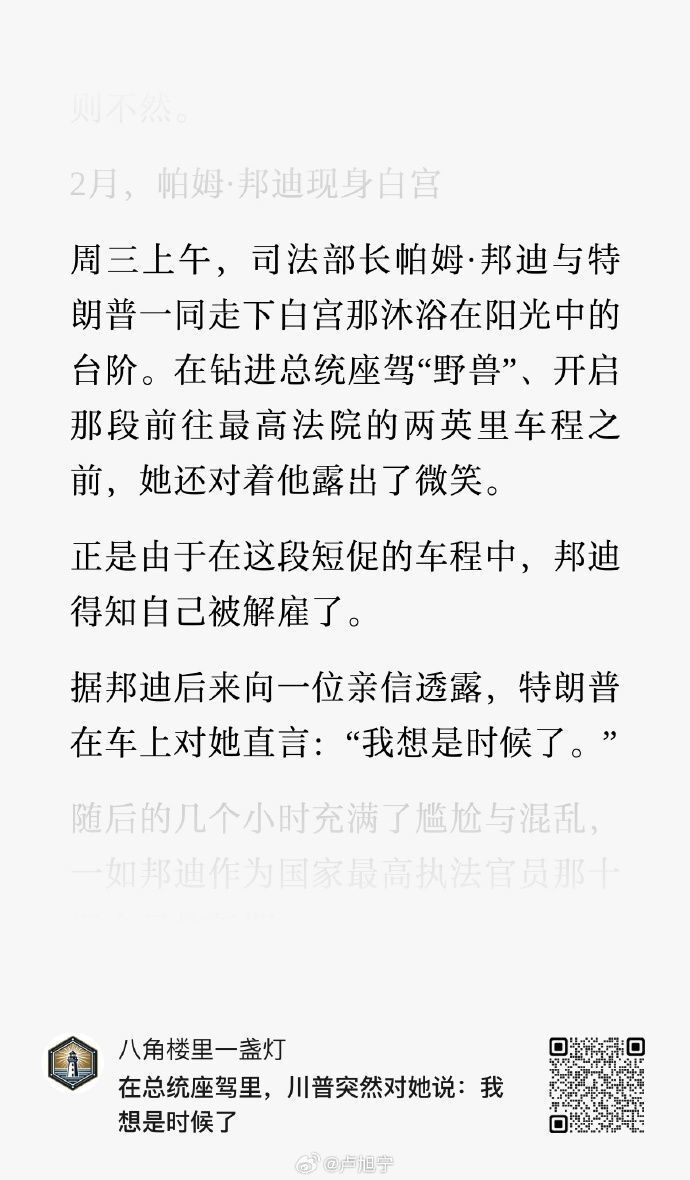 #美国#总统#特朗普#宣布解除司法部长邦迪职务。邦迪是特朗普第二个总统任期内第二名被解职的内阁成员。