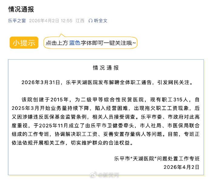 4月2日,据乐平市“天湖医院”问题处置工作专班通报:2026年3月31日,乐平天湖医院发布解聘全体职工通告,引发网民关注。