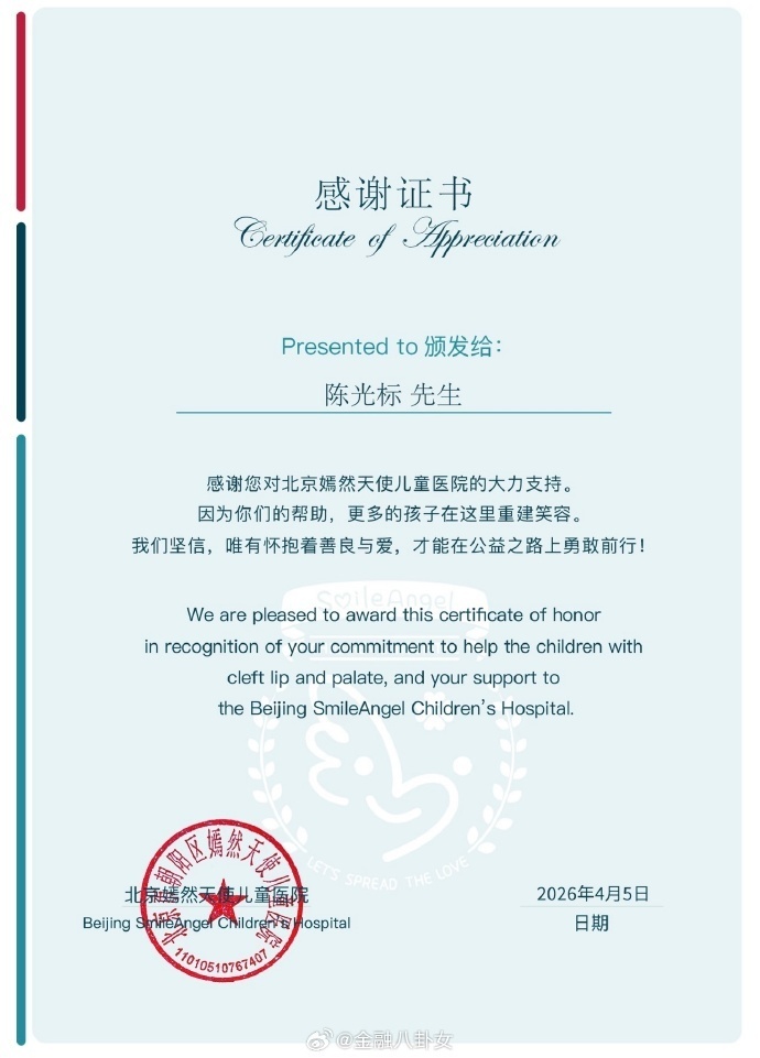 【6】嫣然医院发布证书感谢陈光标捐赠1000万